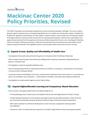 The COVID-19 pandemic has dramatically reshaped the economic and policy landscape in Michigan. The crisis our state is going through has exposed serious and longstanding deficiencies in our health care and education systems. Outdated and burdensome regulations interfered with our state’s ability to respond nimbly to a fast-moving crisis until they were waived. As Michigan prepares for the post-COVID recovery from an unprecedented shutdown of the economy, state leaders must apply the lessons learned from this experience so that we are better prepared for the next crisis. Accordingly, the Mackinac Center has revised its 2020 policy priorities to reflect the most important and time-sensitive issues state leaders should address during the remainder of this legislative session to protect public health and promote economic recovery.