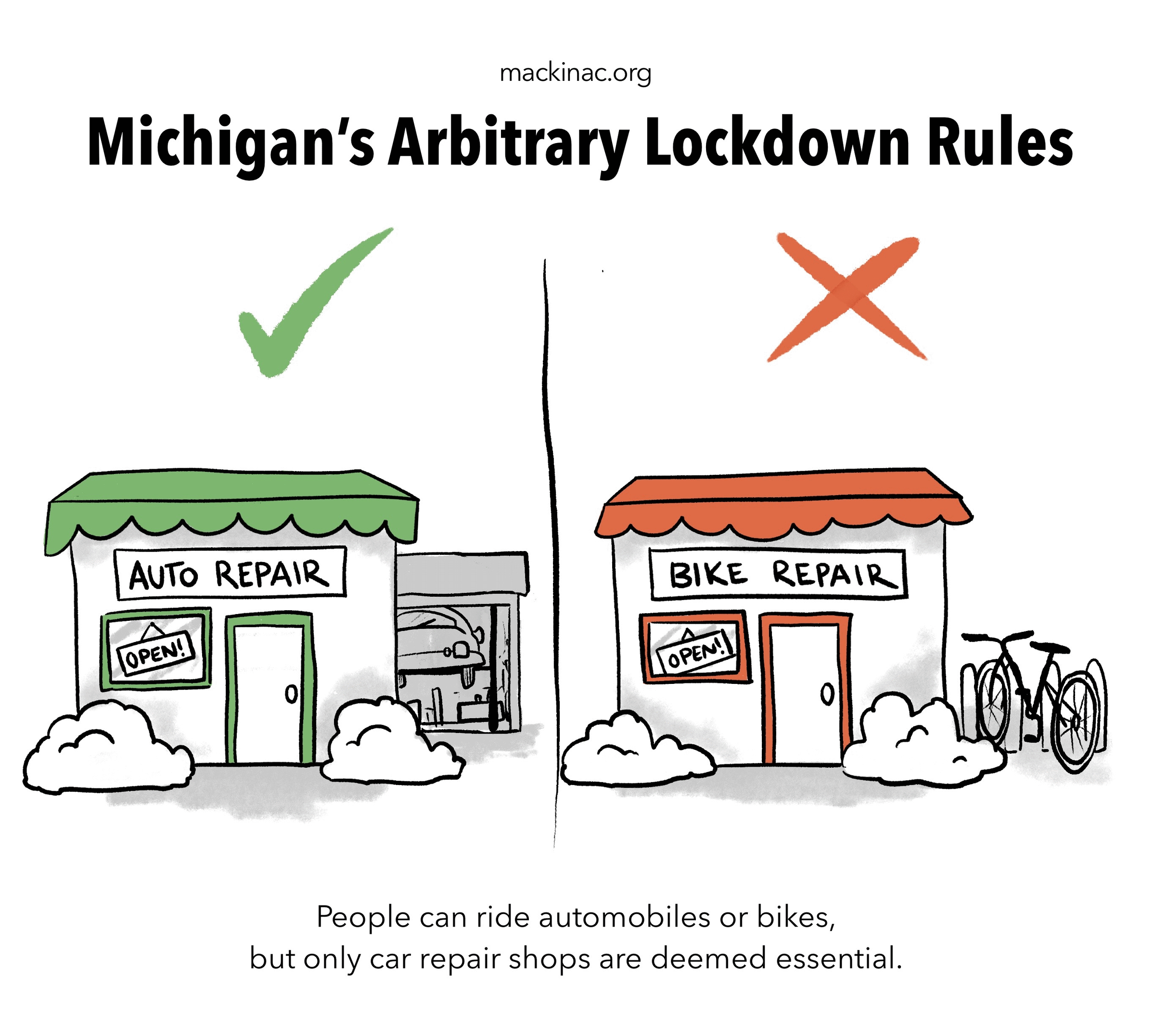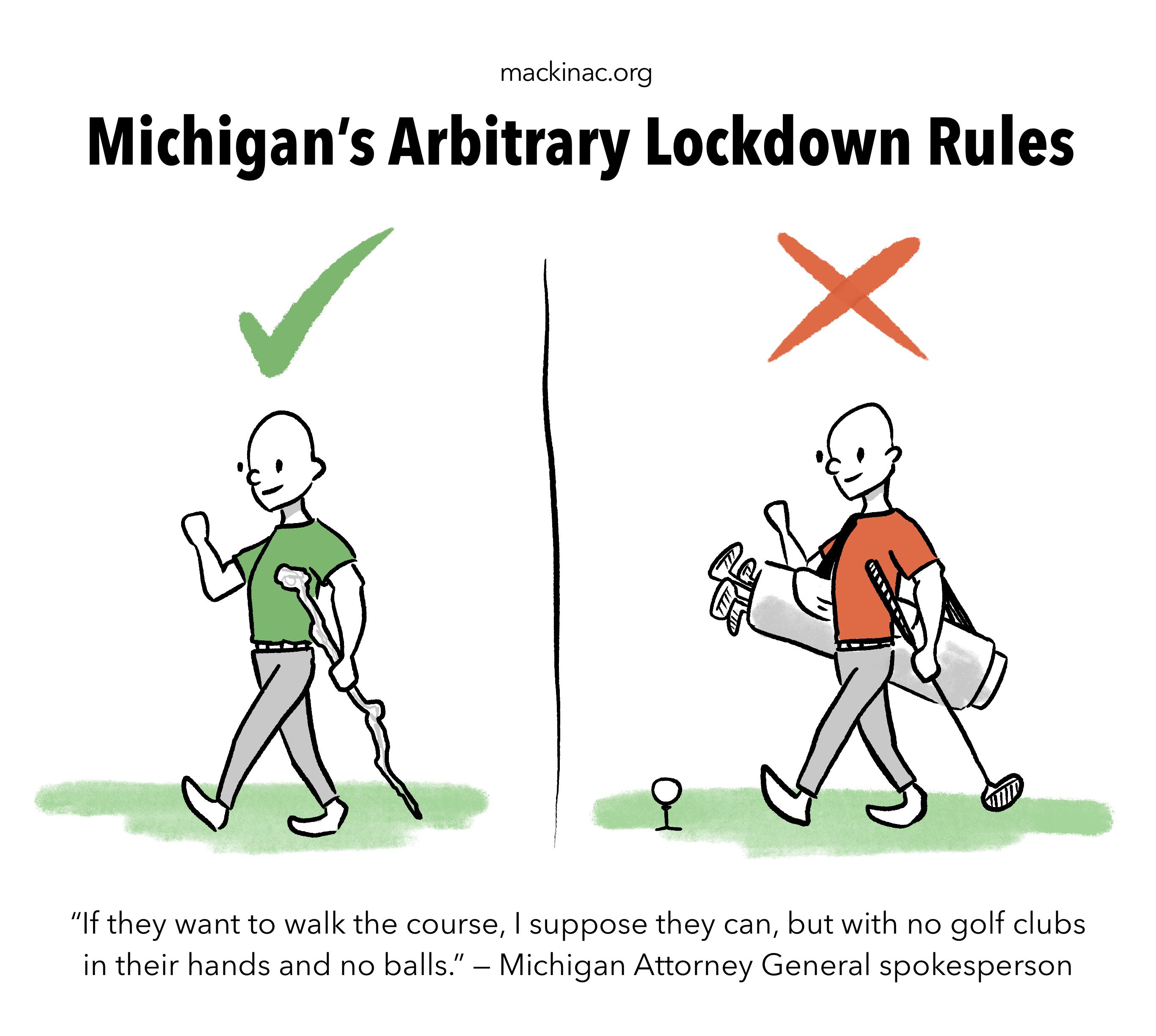 While most people agreed that Michigan citizens and businesses needed to impose restrictions in order to fight the COVID-19 crisis, the executive orders locking down the state were often arbitrary and overly restrictive. To show some of the problems with the shutdown rules, Mackinac Center graphic designer, Ilia VanDerhoof, drew a series of cartoons. These were immensely popular — ultimately being seen and shared by hundreds of thousands of people in Michigan. Most of these regulations were ultimately revised by the governor.