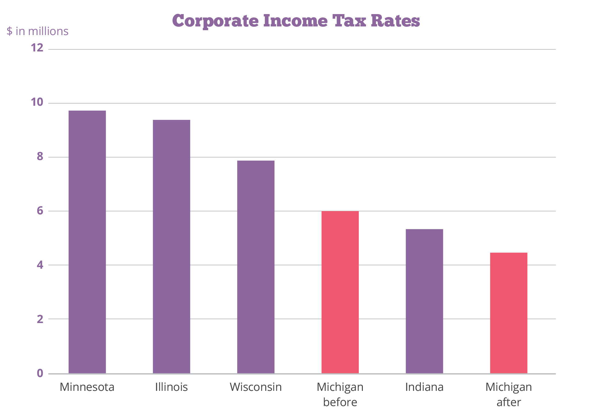Wisconsin and Ohio recently reduced their income tax rates in response to the pandemic. Ohio now assesses lower rates than Michigan, and this proposal puts Michigan’s flat tax rate below Ohio’s highest tax rate in its tiered tax system.