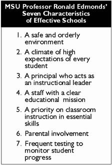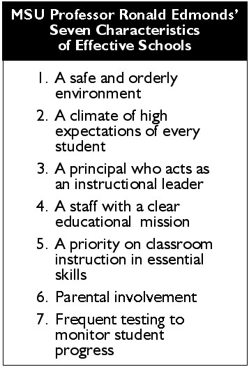 His research isolated seven characteristics of effective schools: a safe and orderly environment, a climate of high expectations of every students, a principal who acts as an instructional leader, a staff with a clear educational mission, a priority on classroom instruction in essential skills, parental involvement and frequent testing to monitor student progress.