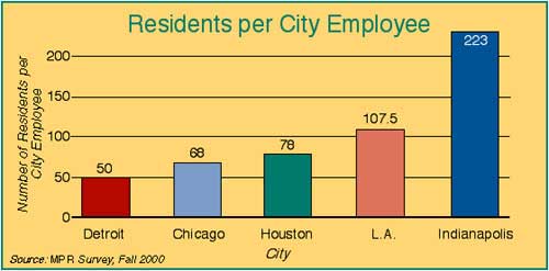 The city government is in fact the second-largest employer in Detroit, behind only Detroit Public Schools. Of the city's 25 biggest employers, state, county and city governments provide a combined 40 percent of jobs. By contrast, the same government units provide only 30 percent of jobs in Chicago. This top-heavy bureaucracy has placed an enormous burden on city taxpayers.