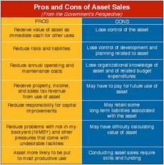 In the political and economic tradeoffs that ensue, the tendency to entertain the idea of selling assets as a kind of afterthought to the budget process will become a thing of the past. Government pros and cons of selling assets, listed in the table accompanying this article, will play a role in the decision to fund each budget item. In the past, without asset values or costs on their balance sheets, for most governments the cons outweighed the pros. But with the new accounting standards, this may change dramatically.