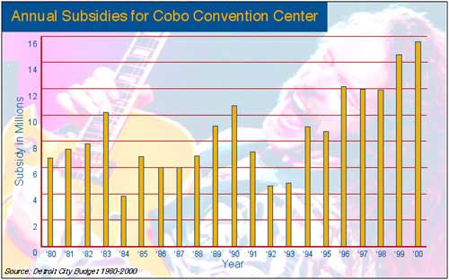 Since 1980, the city has spent $182.5 million to subsidize the Civic Center department, which runs Cobo Center. That works out to an annual average bill to taxpayers of $9.1 million, and in fiscal year 2000-2001, the city budgeted more than $15.5 million to subsidize the Civic Center's operations.