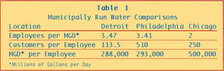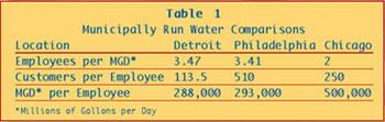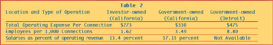 Detroit's water efficiency does not stack up well against other municipalities. How does it fare against investor-owned utilities? The first two columns in Table 2 represent data from a 1996 Reason Foundation study entitled, Restructuring America's Water Industry: Comparing Investor-Owned and Government- Owned Water Systems. The third column reports Detroit's water expenses per connection, and employees per connection. As the data suggests, Detroit could may be able to improve its efficiency dramatically if it would sell the system to a private concern.