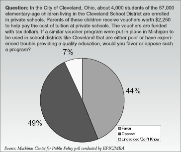 The decision came on the heels of a new Mackinac Center for Public Policy poll conducted by EPIC/MRA, which indicated that more Michigan voters oppose Cleveland-like vouchers than support them. The poll of 600 active Michigan voters conducted June 19-25 showed that 49 percent of the respondents are opposed to vouchers, compared to 44 percent in favor.