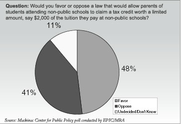 The same poll illustrated that 48 percent of respondents favor an education tax credit so that families can send their children to non-public schools, compared to 41 percent opposed. Education tax credits allow taxpayers to reduce their tax bill when they pay tuition costs to non-public schools. The poll also shows an even wider margin of support for tax credits for individual or corporate contributions to scholarship programs to non-public schools. Some 56 percent are in favor, compared with 34 percent opposed. Such a program has been in operation in Arizona since 1998.