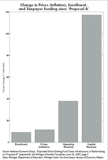 The study underscores how much capital revenue for schools has skyrocketed since passage of Proposal A. Capital revenue includes both sinking funds and the proceeds from other bond debt for building and site expenses. Since Proposal A was enacted in 1994, capital revenue has more than doubled. Meanwhile, operating revenue has grown by less than 40 percent, and general price or inflationary changes have been far less than 20 percent (see graph).