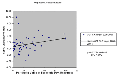 Using regression analysis the Mackinac Center examined per capita state expenditures on economic development programs and changes in per capita GSP to see if there is a strong correlation between the two for all 50 states. The Center regressed this data for a number of time periods. It also tried to find correlation between economic development expenditures and changes in state per capita income for different periods. In every instance the analysis showed a correlation that was insignificant.