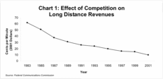 Competition in long distance service yielded dramatic consumer benefits. As shown in Chart 1, average revenues per minute for interstate and international calls originating in the United States dropped from 62 cents per minute in 1983 to 10 cents per minute in 2001. In many instances, calling across state lines and even international borders cost less than toll calls within a single state.