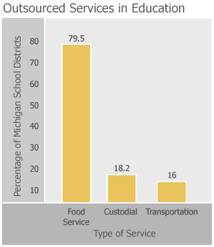 In 2003, the Mackinac Center for Public Policy conducted a survey of Michigan’s 555 school districts in order to assess the extent and effectiveness of contracting with private-sector firms. Of the 517 districts that responded, 176 districts — 34 percent — said they outsource at least one noninstructional service. Of the duties these public school districts outsource (some schools outsource more than one service), the most popular by far is food services with nearly 80 percent employing a private company to manage district cafeteria employees or programs. Another 18 percent contract for custodial duties, and nearly 16 percent do so for their transportation needs.