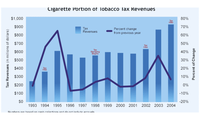 Michigan tobacco users have suffered several large tax increases. In 1994, Michigan raised its 25-cent cigarette tax to 75 cents — a 200 percent hike. Taxes were increased by 50 cents more in 2002. With last year’s hike, the cigarette tax now stands at $2.00 per pack — fourth highest in the country.