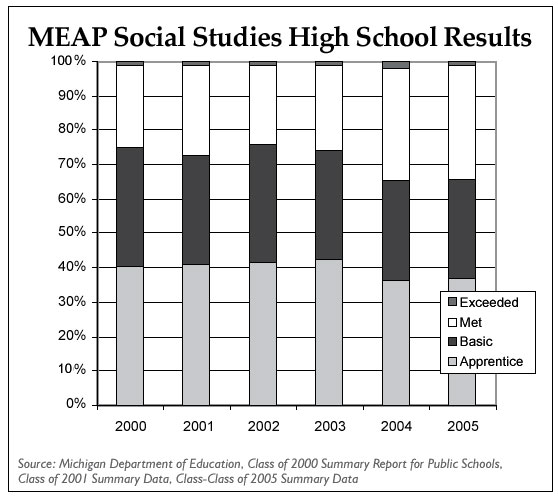 Social studies comprises a significant part of the Michigan Educational Assessment Program test taken by Michigan 11th graders. From 2000 to 2005, an average of only about 28 percent of test-takers met or exceeded state standards in social studies. This means that, on average, nearly three-quarters of students who graduated from Michigan public high schools in the past six years did not meet the state’s standard for knowledge of basic economics, world geography, and the history and institutions of the United States and Michigan. Admittedly, not each of these areas is required by the state for graduation, though they may be by local districts.
