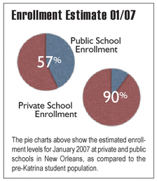 Compare that to independent schools. Before Katrina hit, some 40 percent of New Orleans-area students attended private and parochial schools. By the end of January almost 80 percent of students in the Archdiocese of New Orleans had returned to classes. This was possible because the archdiocese covers a large geographic region, including areas outside of the damage area. Students were able to attend other schools in the archdiocese, as well as those in Baton Rouge, about an hour from New Orleans. Within the greater New Orleans area, the archdiocese was able to reopen 25 of 28 schools in the months following Katrina. Another 200 private schools have not reopened, and contact with the administrators from those schools has been difficult.