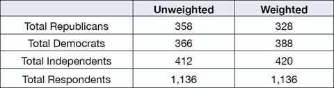 In the following table, the "unweighted" column contains the number of respondents in the sample according to their party affiliation. The "weighted" column, in contrast, contains the number of respondents after weights are applied to more accurately reflect the actual population.