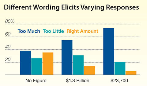 From a budgetary standpoint, expenditures of $23,700 per prisoner and $1.3 billion in total are equivalent. Yet public opinion about the appropriateness of each figure varies remarkably, as does the result when no figure is cited.
