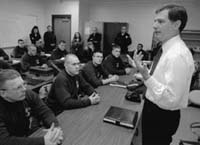 Indianapolis Mayor Stephen Goldsmith explains his views of city government to Indianapolis police recruits. Police and fire services are among the few services that the mayor has promised not to open to competitive contracting. |
