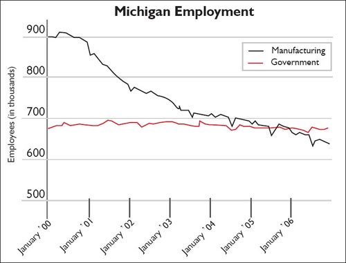 Throughout the 20th century, Michigan has been associated with manufacturing. Look up Michigan in an encyclopedia or school textbook and you will likely read about industrial giants, assembly lines, unions and mass production. But an employment shift in 2006 may signal that Michigan in the 21st century will be known as the government state.