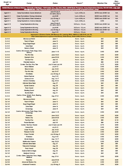 Michigan’s budding scientists are well-served by a wide-range of summer science camps. The state’s science museums offer camps that accommodate kindergarteners to high school seniors, with an array of subject matter, including astronomy, forensics, climatology, entomology, chemistry and physics. Many science camps also accommodate working parents by offering before- and aftercare.