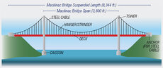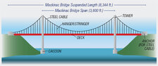 The Mighty Mac measures 26,372 feet, from Mackinaw City in the Lower Peninsula to St. Ignace in the Upper Peninsula. The roadway of the bridge is suspended from steel cables strung between two concrete-and-steel towers, and anchored at both ends in 170,000-ton concrete blocks that descend to bedrock 100 feet below the water and rise 119 feet above the surface. Each of the two cables is composed of 37 strands of 340 wires that each measure 0.196 inches in diameter, for a total diameter of 24.25 inches.