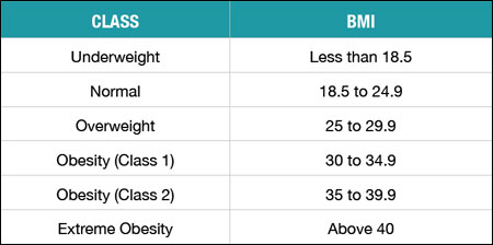 What defines obesity in medical terms is the body mass index, a calculation of the ratio between a person’s height and weight.[8] Various classifications, ranging from "underweight" to "extreme obesity" were established according to the level of disease risk.