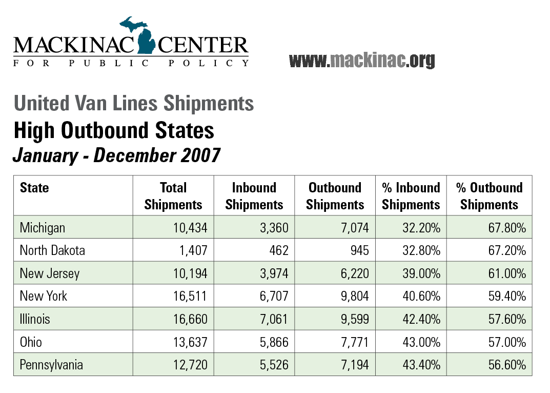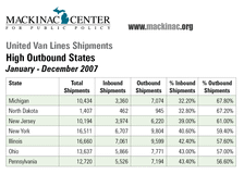 Saginaw-based Stevens Worldwide Van Lines reports numbers similar to those posted by UVL. Morrie Stevens, chairman and CEO of the 102-year-old company, told the Mackinac Center that in calendar year 2007 his company’s shipments have been running 2-1 in favor of leaving Michigan. He believes the outbound traffic is "a function of the weak economy as displaced workers and young people leave to find better opportunities elsewhere."