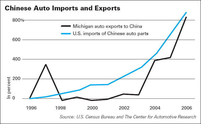 The Chinese demand for Michigan vehicles and auto parts grew exponentially, from $41.6 million in 2001 to $446 million in 2006. Other important growing markets in China for Michigan products include inorganic chemicals, machinery, medical instruments and soap.