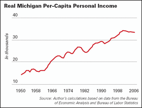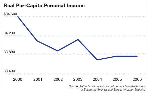 The thesis of the MFRP report is based on aggregate personal income in Michigan. But aggregate figures do not account for changes in population and therefore distort income trends. A more appropriate measure of earnings is per-capita personal income, which accounts for changes in population and thus better reflects the actual earning power of individual Michigan citizens. Indeed, from 2001 through 2006, Michigan’s per-capita personal income increased by 12.8 percent, while inflation increased by 13.8 percent, which represents an inflation-based decline in earnings — not the increase claimed by the MFRP.