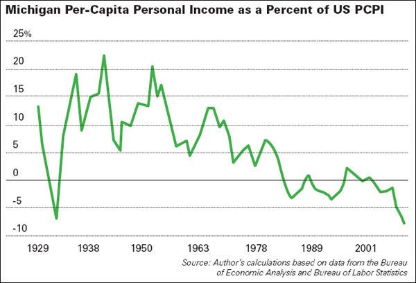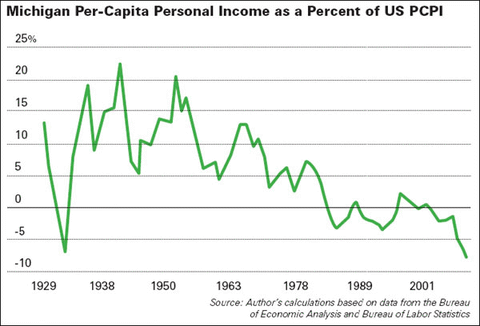 In relative terms, Michigan’s per-capita personal income has hit a record low of 7.8 percent below the national average — worse than during the Great Depression. And if present trends continue, even Alabama will pass Michigan in per-capita personal income in the next three years. This state of affairs hardly argues for imposing a heavier tax burden here.