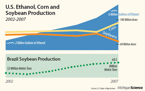 Nearly 7 billion gallons of ethanol are now produced annually in the United States, an increase of some 250 percent in the past five years. The data above illustrate how policy choices can produce unintended consequences.