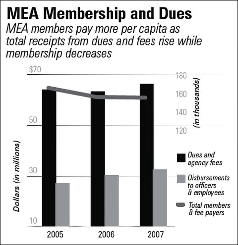 Michigan Education Association members paid about $66.6 million in dues and fees to the union in 2006-2007, a 5 percent increase over the previous year even as the number of active teacher memberships decreased. Total income and spending by the MEA, the state’s largest employee union, also increased.