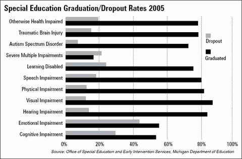 Even though the overall graduation rate among the special education population in Michigan has increased steadily in the past decade, from 33 percent in 1996 to 70 percent in 2006, Lipsitt calls it "abysmal."