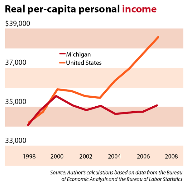 But the gains in the nation have not meant gains for Michigan. As the chart below shows, Michigan incomes have effectively stagnated since 2001, while the national growth has been strong since 2003.