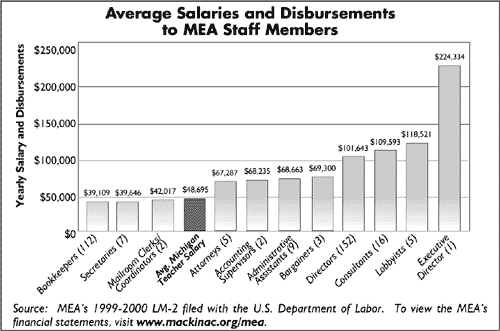 The information, part of an annual report labor organizations are required to file with the U.S. Department of Labor, revealed that 125 staffers of Michigan's largest school employee labor union received salaries and disbursements of over $90,000 from September 1999 to August 2000. The average Michigan teacher salary is $48,695. ...