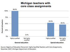 Earlier, Michigan had reported that 99 percent of all its core classes, including special education courses, were taught by teachers who met highly qualified standards set by the federal No Child Left Behind Act. But the state was required to conduct a recount after the federal department learned that Michigan considered special education high school teachers "highly qualified" if they had passed an elementary-level content examination. That's not enough to demonstrate their knowledge of the subjects they teach, federal officials said.