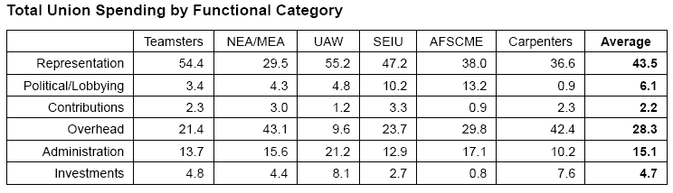 With these caveats in mind, it appears that 55.2 percent of UAW dues ultimately go toward representation, with 21.2 percent going into administration and 9.6 percent spent on overhead. Our summary of the UAW follows: