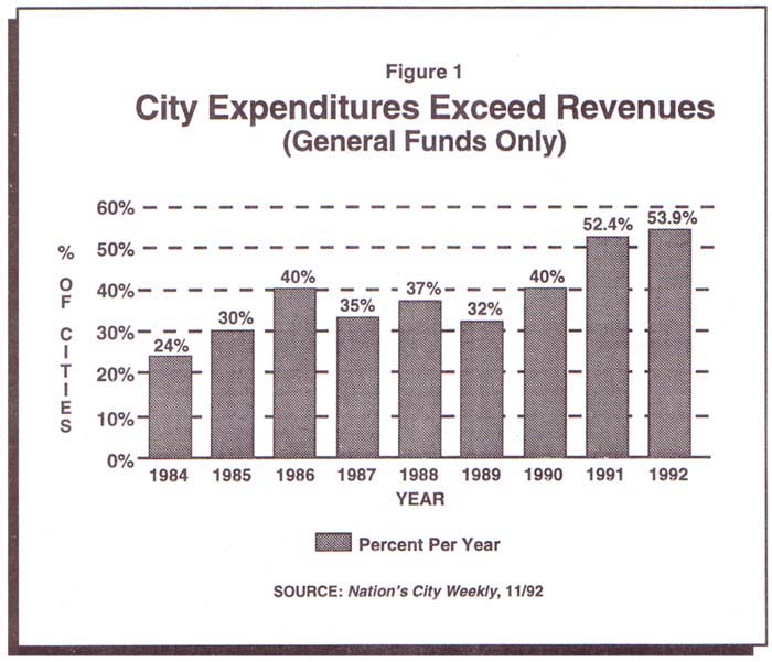 According to a report from the National League of Cities, over half of the country's cities and towns were facing budget deficits as of July 1992. Of the 620 cities and towns that responded to the League of Cities survey, 54 percent reported budget deficits for 1992, slightly more than in 199 1. Moreover, small cities and towns are just as likely to be facing red ink as large urban cities.