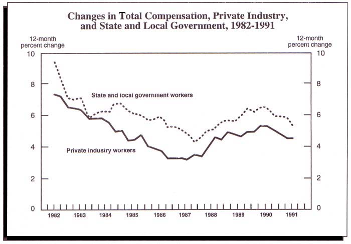 Not only has the number of city employees mushroomed over the last decades, but so has their pay. From 1980-1990, state and local public employees received an average annual compensation increase of $4,258. This amounts to increases of $6.32 for every $1.00 of private-employee increase during the same time period, according to a report from the American Legislative Exchange Council (ALEC).[8] These findings were reinforced by the December 1991 U.S. Department of Labor report on Employment Cost Indexes and Levels 1975-91 (see Figure 2 above).