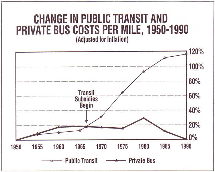 While public-transit costs outpaced inflation over the past two decades, private bus industry costs per mile declined relative to inflation. From 1970 to 1985, real private-sector costs per mile declined 8.3 percent[9] compared to the 64 percent real increase in public transit. If public-transit costs had risen at the rate of increase in the private bus industry, service levels now could be more than double the 1989 level.[10]