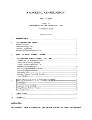 This Executive Summary is based on a Mackinac Center Report, "Tort Law and the Products Liability Insurance Crisis" by Brad Smith. Copies of the full 56-page report are available from the Center for $10.00, or at no charge for Michigan media. Copyright 1989 by the Mackinac Center. Nothing in this summary should be construed as an attempt to aid or hinder, the passage of any particular legislation.