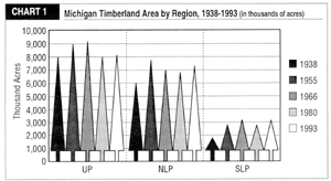 There are 3.0 million acres of timberland in the southern Lower Peninsula (SLP) and 7.2 million acres in the northern Lower Peninsula (NLP). Timberland makes up 21% and 63%, respectively, of all the land in these regions. The eastern Upper Peninsula (EUP) has 3.8 million acres of timberland and the western Upper Peninsula (WUP) has 4.6 million acres. Because timberlands make up 77% of the eastern half and 84 percent of the western half of the UP, they exert an especially strong influence over the economy of this region.