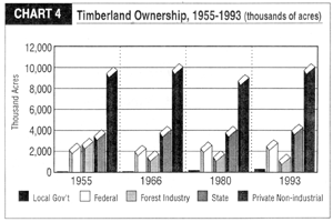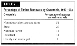 Removals of timber from timberland do give an indication of harvest activity, although such removals may include clearing of trees not for timber production. Average annual removals over the period 1980 to 1993 were 266 million cubic feet per year from 1980 to 1993(US Forest Service 1994). Non-industrial private lands are the location for over half of this activity (Table 2).