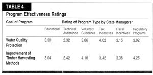 Program managers do not rate highly the effectiveness of government programs to protect water quality or improve timber harvesting (Table 4). Recognizing that these are managers' opinions rather than controlled evaluations, these ratings still suggest state dissatisfaction with regulatory programs related to forest practices. Technical assistance received the highest ratings from managers, followed by educational programs for timber-harvesting methods, and fiscal incentives for water quality protection.