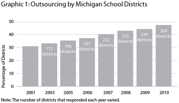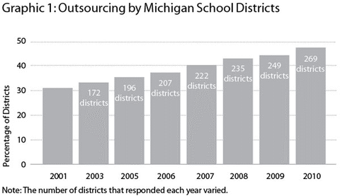 Since 2003 custodial service contracting in Michigan public schools grew 300 percent, from 6.6 percent of all districts contracting to 26.3 percent.