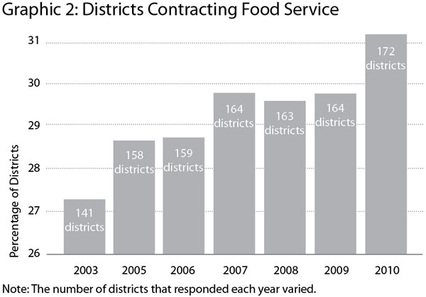 Food service continues to be the most frequently contracted service, with 172 districts using private contractors. Twelve new districts contracted out food service this year.