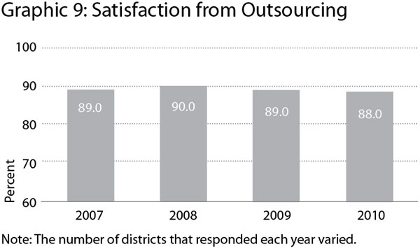 Over the years of performing this survey districts dissatisfied with their contracted service have been rare. Districts satisfied with their private contractors have been between 88 percent and 90 percent over the last four surveys.