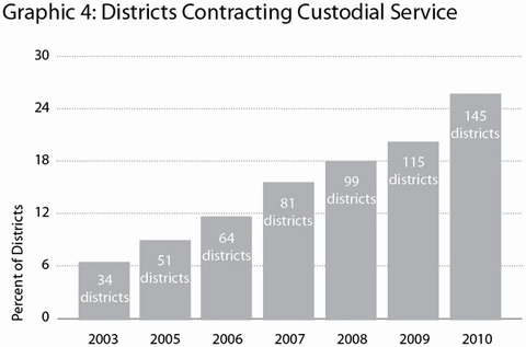Contracting out for custodial services grew substantially this year. From 2009 the number of those districts contracting out their custodial services increased 5.4 percentage points.