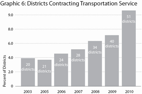 While transportation is the least contracted-out service, privatization is growing considerably. Since 2003 transportation service contracting more than doubled (growing 139 percent), though less than 10 percent of districts contract out for this service.