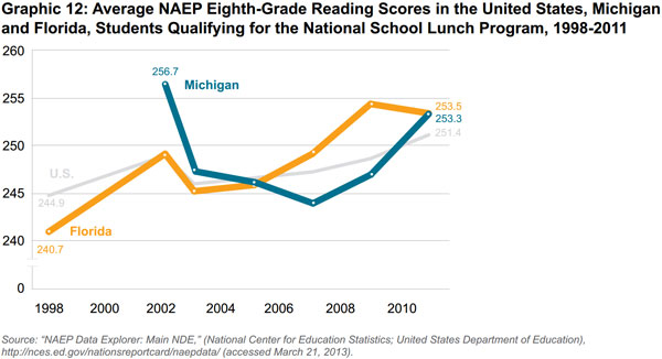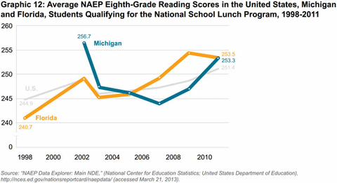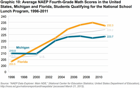 Similar trends hold when comparing the test scores of low-income students in both states. Altogether, then, Florida’s initial test scores were lower than Michigan’s in a total of eight different grade, subject and student family income categories, but rose quickly enough to pass Michigan’s by 2009.