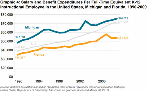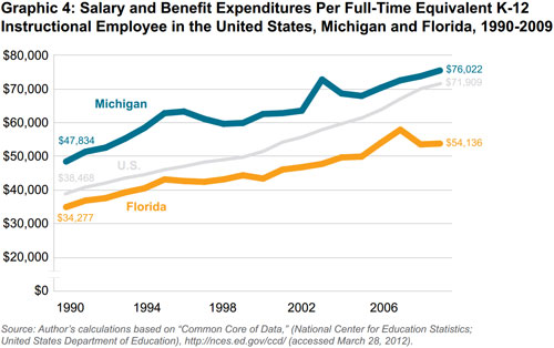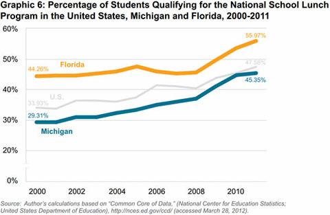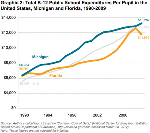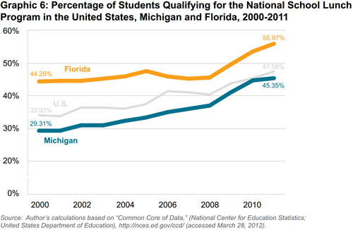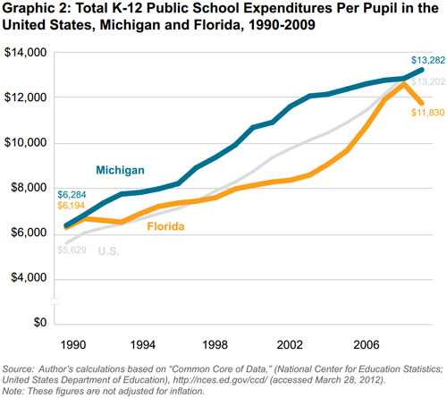 Yet many people would have expected Michigan to post higher average test scores than Florida. Every year from 1990 to 2009, Michigan spent more per pupil than Florida and spent more compensating teachers. From 2000 to 2011, Michigan also had a smaller share of low-income students — that is, students whose family incomes were low enough to qualify for a federally subsidized free or reduced-price lunch.