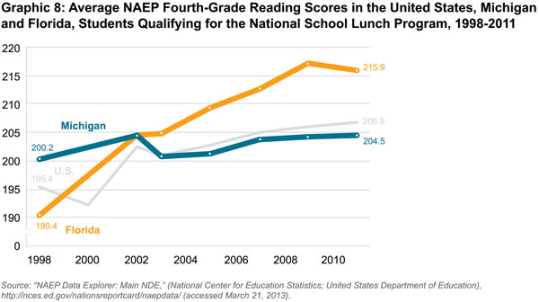 Over the last 15 years, students in Florida have demonstrated remarkable improvements in average fourth- and eighth-grade reading and math scores on the National Assessment of Educational Progress, a standardized exam often referred to as “the nation’s report card.” Meanwhile, during the same period, the same NAEP test scores in Michigan have improved only slightly or not at all. This study examines both states’ results, describes the education policies that likely contributed to Florida’s success and suggests how Michigan could improve student achievement based on the Florida model.